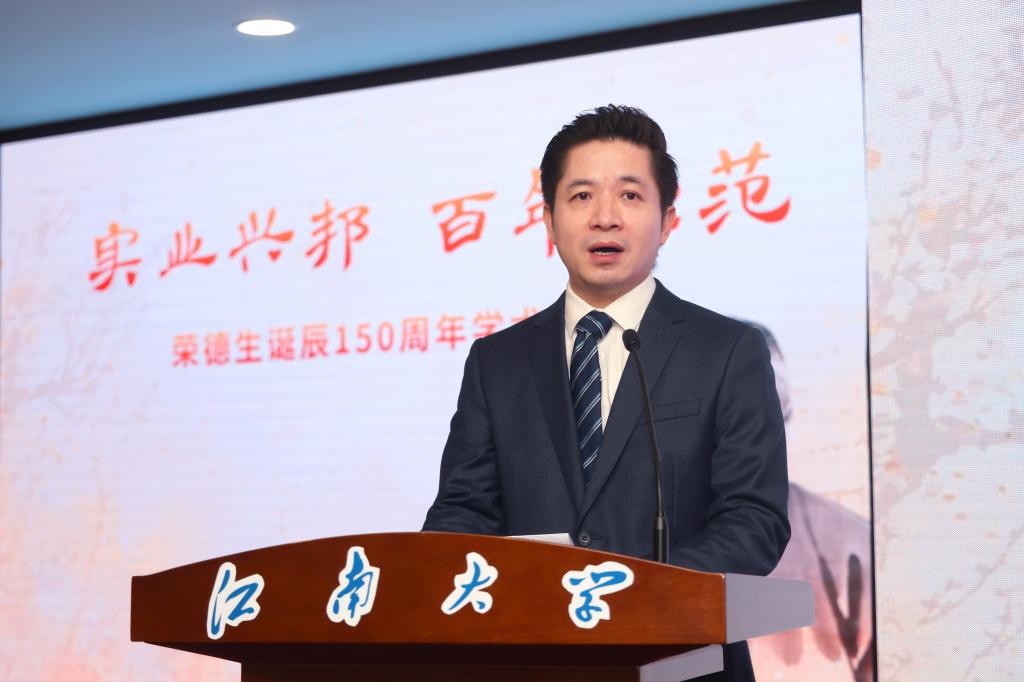 吴正国在讲话中,对荣智健先生以及荣氏家族一直以来对学校的信任和厚爱表示感谢,并向各位领导、嘉宾和专家学者的到来表示热烈欢迎。他指出,荣氏家族以家国情怀为根脉,以教育传承为己任,与江南大学的发展结下了深厚渊源,这种一如既往的家国情、教育情、江大情已成为学校发展历程中不断坚守初心、奋楫笃行的精神力量。他强调,本次研讨会旨在追忆荣德生的爱国情怀、创业硕果和人生价值,启迪激励年轻学子和新一代企业家,弘扬爱国之情和报国之志。他表示,学校将始终赓续“实业兴学”的办学传统,坚持弘扬“崇实笃行”的校风学风,聚力传承“经世致用”的办学精神,奋力谱写“中国特色、世界一流、江南风格的研究型大学”新篇章。